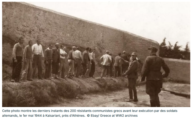 « Des photographies d’une exécution de résistants grecs par des soldats allemands en mai 1944 ont été mises récemment aux enchères sur Internet. La découverte de ces documents a suscité une vive émotion dans le pays, entraînant l’arrêt de la vente par les autorités grecques, qui les a déclaré patrimoine national.