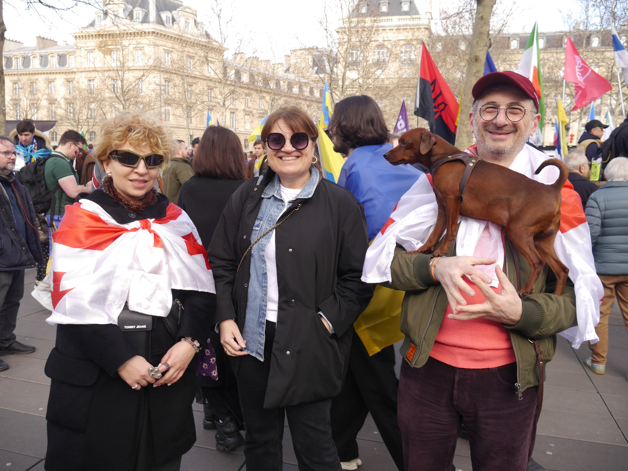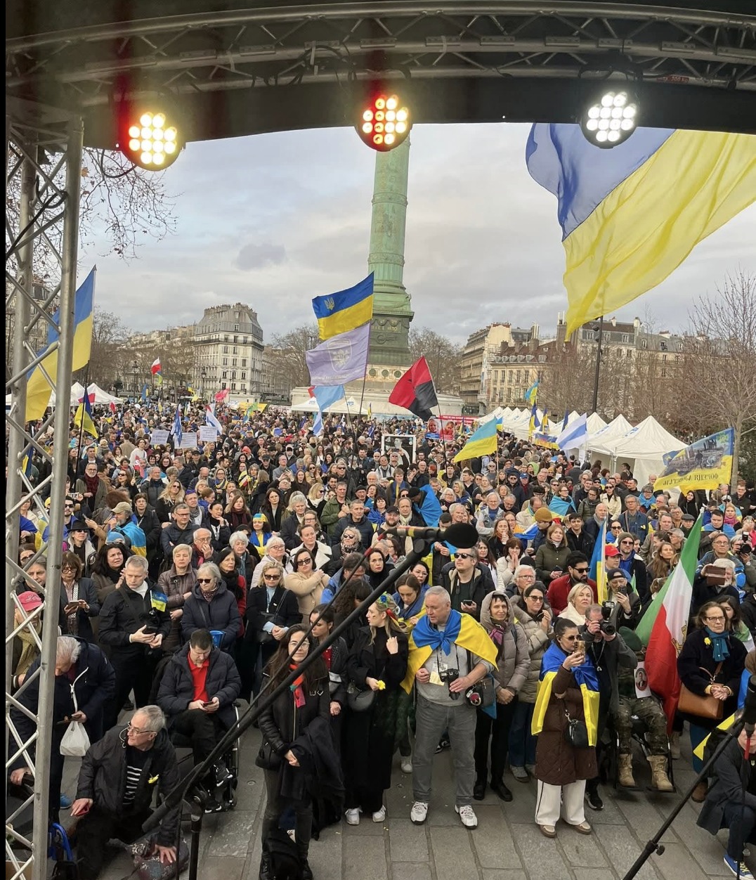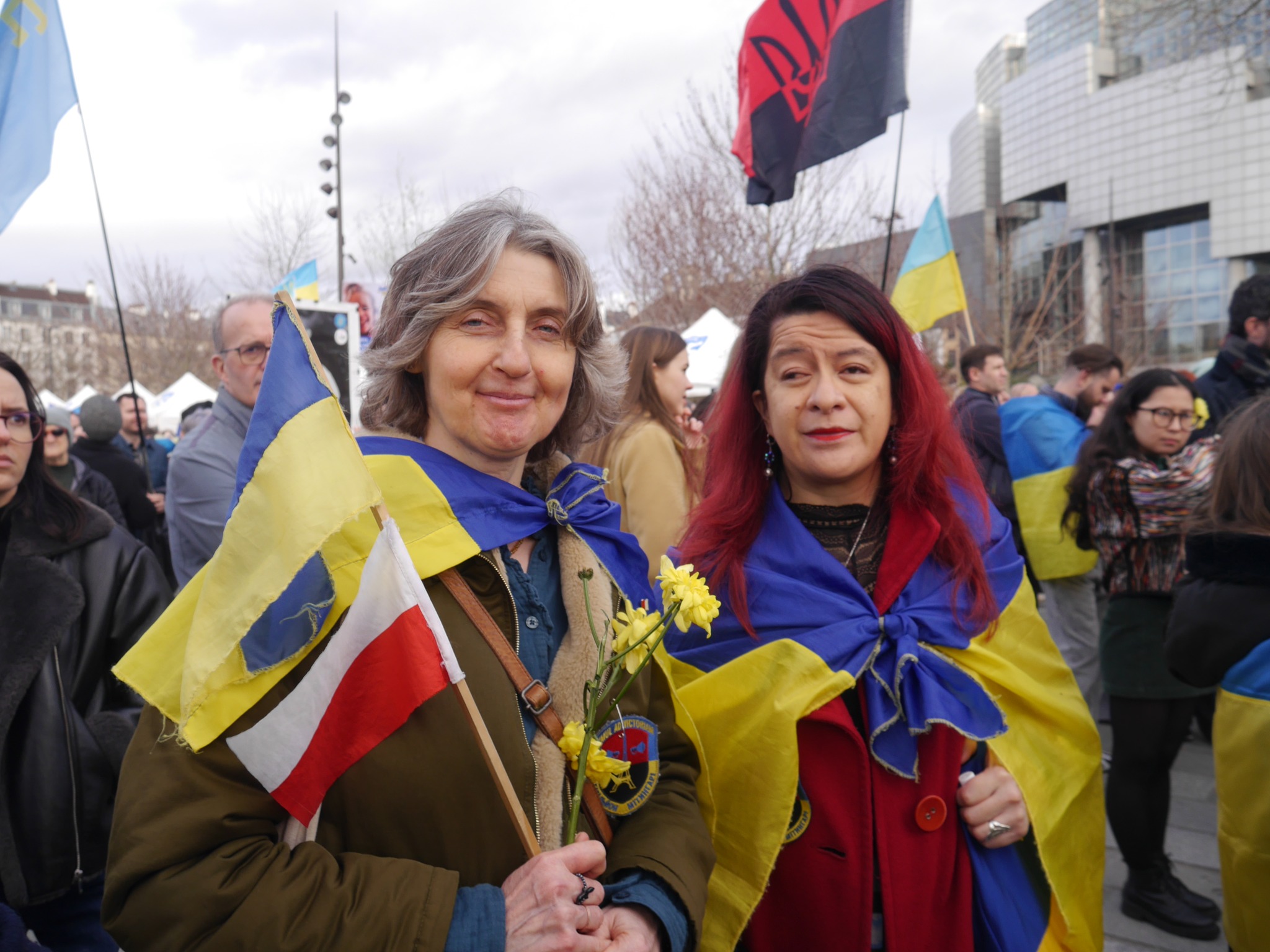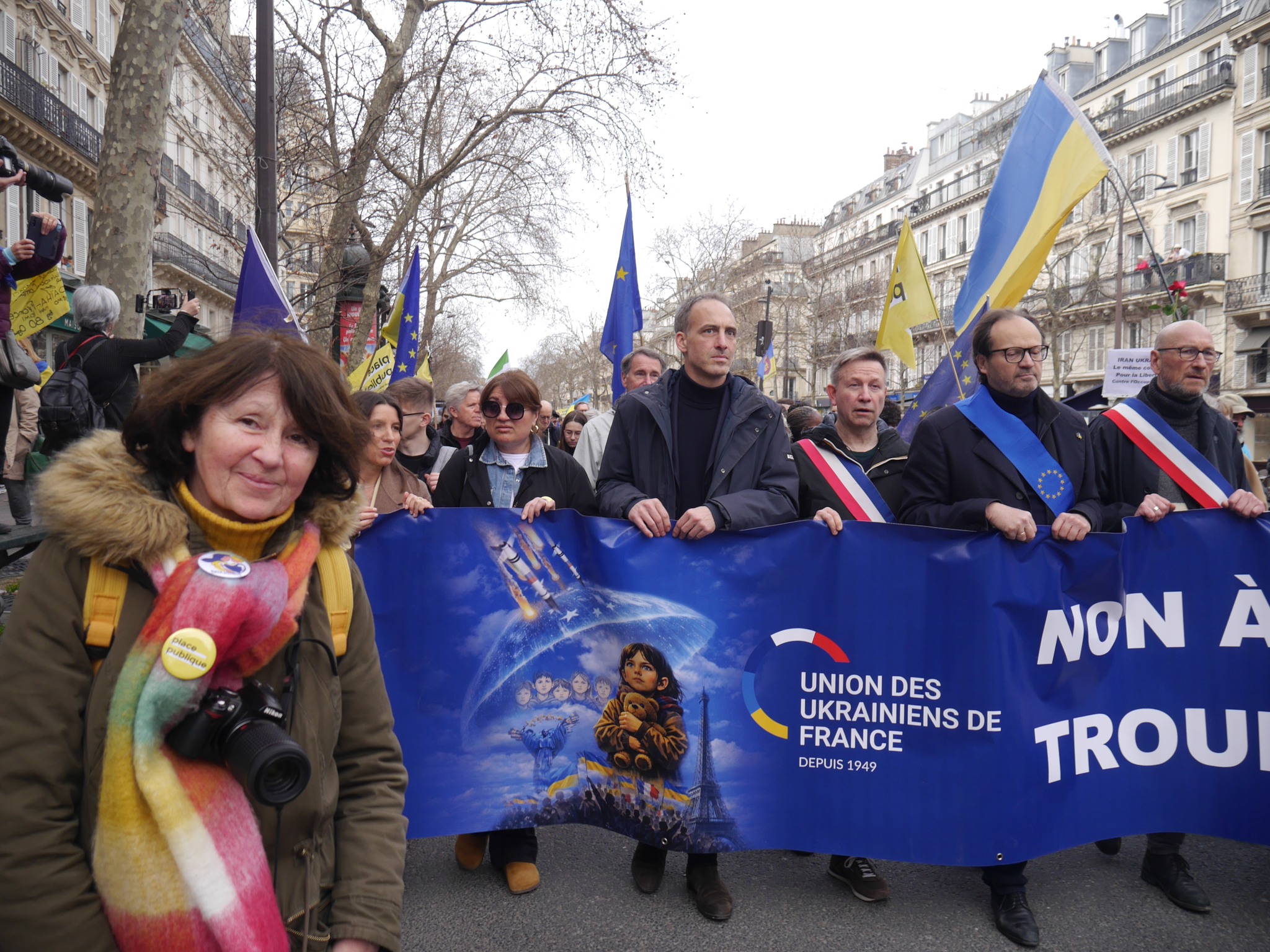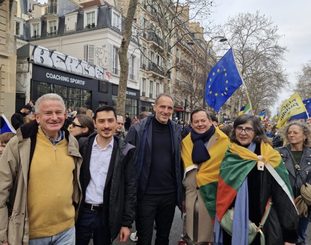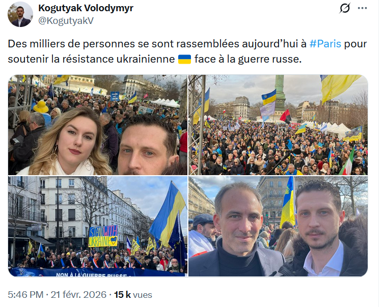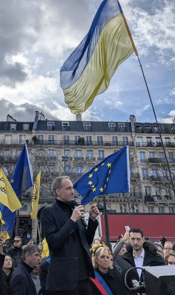 Volodymyr Kogutyak, le vice-président de l’Union des Ukrainiens de France (UUF) et vice-président du Congrès Mondial des Ukrainiens (UWC), a publié sur son compte X - twitter des photos de cette manifestation, dont l’une prise avec Raphaël Glucksmann à ses côtés. Mais sur une autre photo, on distingue un drapeau rouge et noir au centre de l’image, celui de l’UPA...