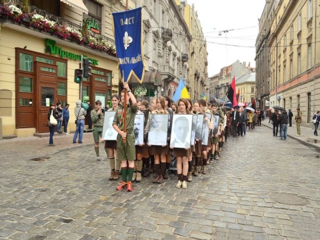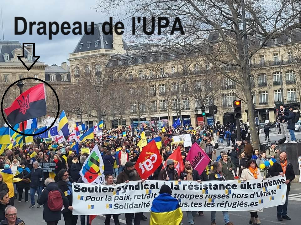 Lors de la « marche et manifestation pour soutenir l’Ukraine en guerre » [1] qui s’est déroulée à Paris le 21 février 2026, le drapeau de l’UPA (l’Armée insurrectionnelle ukrainienne qui était la branche militaire de l’OUN - Organisation des nationalistes ukrainiens -) était de nouveau présent comme le 24 février 2024 [2]. Les commandants historiques de l’UPA, organisation ayant participé à l’extermination des Juifs en Ukraine et au massacre de Polonais, furent les nazis Stepan Bandera et Roman Choukhevytch.